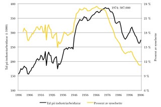 Frå den fyrste industrielle revolusjonen nådde Noreg rundt 1850 og fram til 1974 steig den registrerte industrisysselsetjinga kraftig i Noreg. Så snudde det brått i 1975, og i dei tretti åra som fylgde gjekk talet på industriarbeidarar ned att omlag til nivået etter siste krig. I prosent av sysselsette var nedgangen endå meir dramatisk.