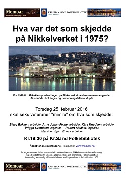 Arrangementet er eit samarbeid mellom Memoar, Nikkelverkets Arbeiderforening og Kristiansand Folkebibliotek. Seks vetaranar skal samtale om endringane på Nikkelverket i åra rundt og etter 1975. Det er vel ikkje tenkjeleg at det også vil bli dradd ein og annan paralell med endringane i olje- og leverandørindustrien nett no.