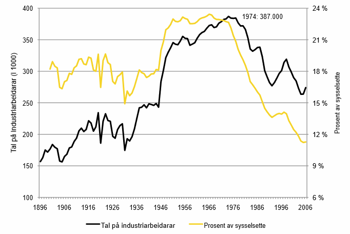 Aukinga i industrisysselsetjing fram til 1975 er såvidt nemnd i ein artikkel som kan lesast av besøkande med god tid. Den vektlegg den fyrste og den andre industrielle revolusjonen og den statlege industripolitikken etter krigen, før den slår fast «sysselsettingen nådde toppen på midten av 1970-tallet. På dette tidspunkt hadde imidlertid en generell nedgang i norsk industri satt inn».