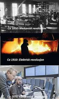 Mi oppfatning er at forteljinga om industriarbeidaren etter 1950 handlar om korleis den tredje industrielle revolusjonen, elektronikken, endevende alt. Forhistoria – den mekaniske revolusjonen rundt 1850 og elektrisitetsrevolusjonen rundt 1900 – er viktige baktepper, men hovudforteljinga går slik:-