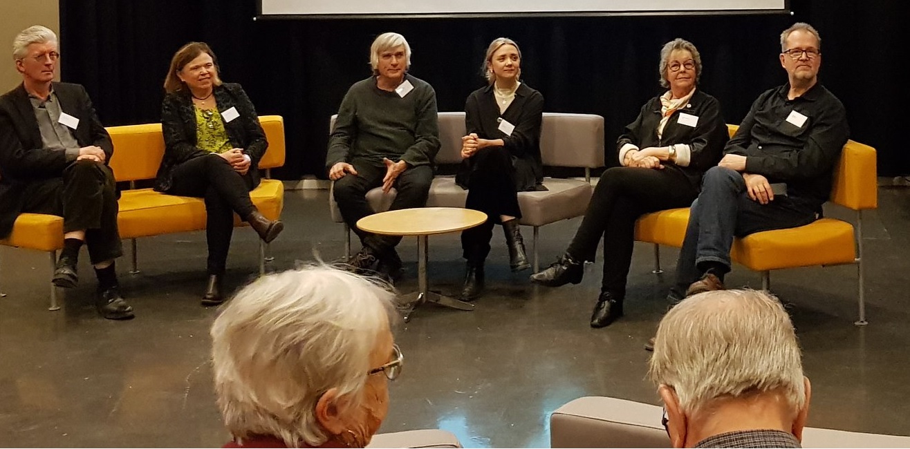 | Knut Kjeldstadli, Marie Smith-Solbakken, hans Jørgen Wallin Weihe, Maja Gurdim Burhjeim, Bente Gullveig Alver, Ola Hemstrøm – frå paneldebatten dag 1 på Memoarkonferansen 2019. Foto: Audun Kjus |
