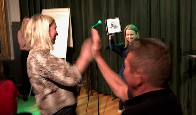 Christine Hope opna, gjennomførte og avslutta arrangementet som – kva heiter det? Los? I alle fall gjorde ho det framifrå, og slik at ho heilt frå start drog salen saman til stort vi. Ho gjorde «dysten« til ein leik, og sette opp ein virtuell scenografi der det nettopp var forteljingane som var det sentrale, ikkje konkurransen.
