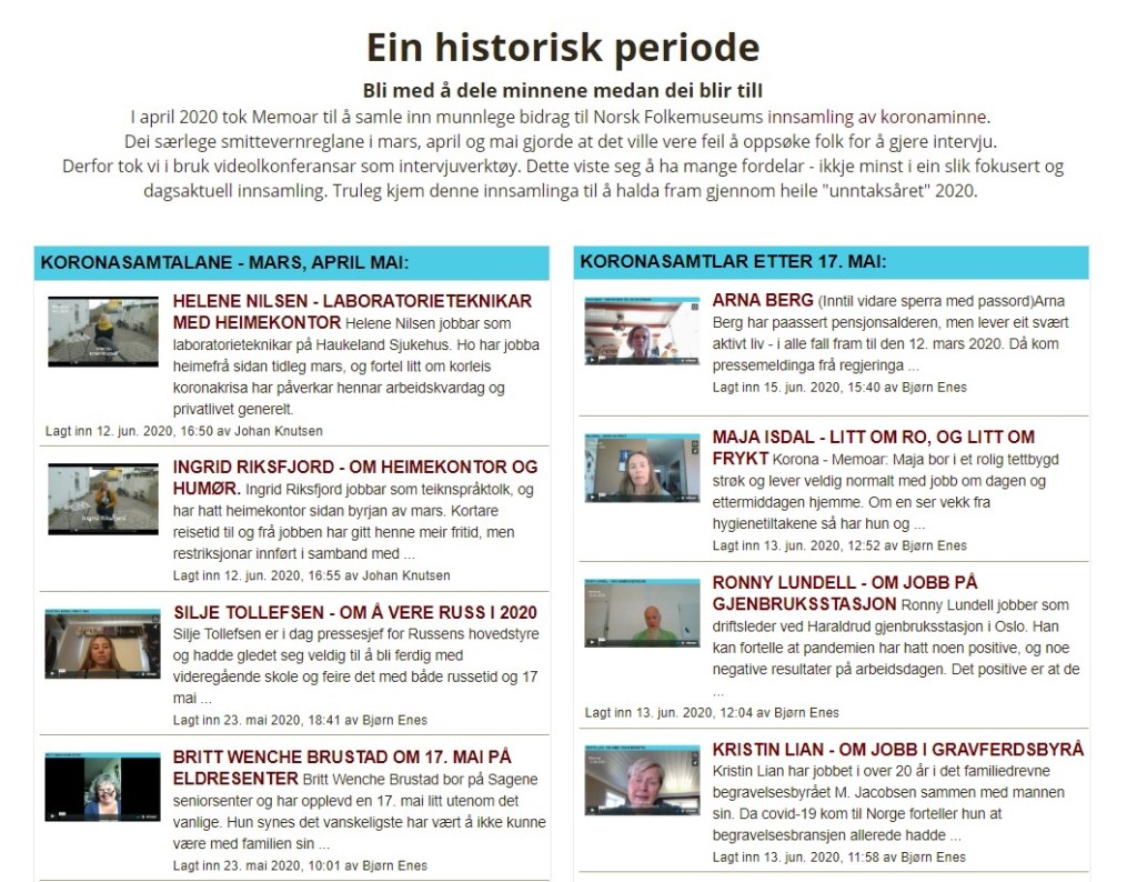 Sjå: www.minner.no/tema/korona (innsendte tekstar og intervju) og www.memoar.no/korona (intervju)